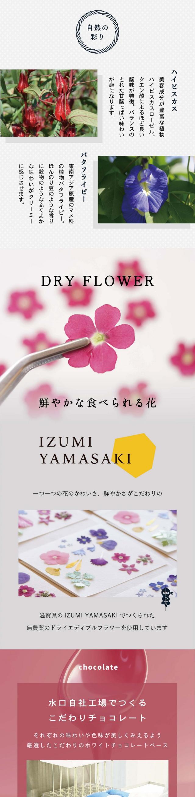 | 原材料名 | 【赤】チョコレート(国内製造(ココアバター、砂糖、乳糖、バターミルクパウダー))、ハイビスカスパウダー/野菜色素、酸味料、乳化剤、(一部に乳成分・大豆を含む) 【白】チョコレート(国内製造(ココアバター、砂糖、乳糖、バターミルクパウダー))、食用乾燥花/乳化剤、(一部に乳成分・大豆を含む) 【黒】チョコレート(国内製造(カカオマス、砂糖、ココアバター))/着色料(バタフライピーパウダー、竹炭)、乳化剤、香料、(一部に乳成分・大豆を含む) |