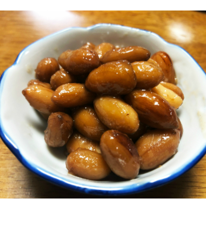 (3) 砂糖200gと食塩2gを一緒に煮溶かしておき、煮上げた落花生と一緒に弱火 で40分間煮れば、出来上がり。