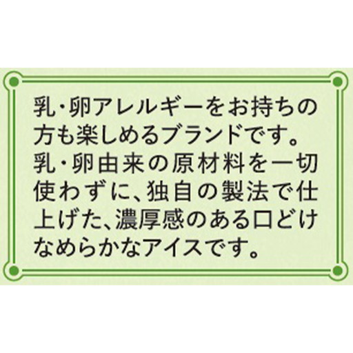 アレルギー特定原材料8品目不使用の豆乳アイス【商品概要】乳・卵アレルギーをお持ちの方も楽しめるブランドです。乳・卵由来の原材料を一切使わずに、独自の製法で仕上げた、濃厚感のある口どけなめらかなアイスです。