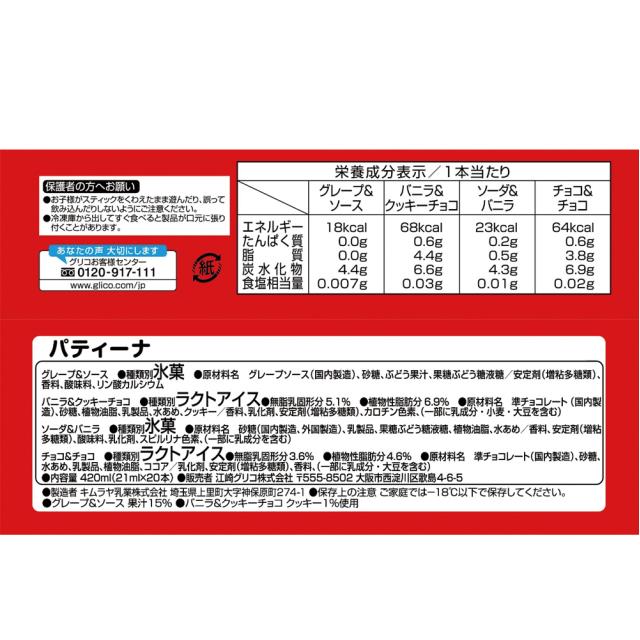 商品名 [アイス] 江崎グリコ パティーナ 21ml×20本×8個 容量 21ml×20本×8個 原材料名 パティーナ グレープ&ソース→グレープソース(国内製造)、砂糖、ぶどう果汁、果糖ぶどう糖液糖/安定剤(増粘多糖類)、香料、酸味料、リン酸カルシウム