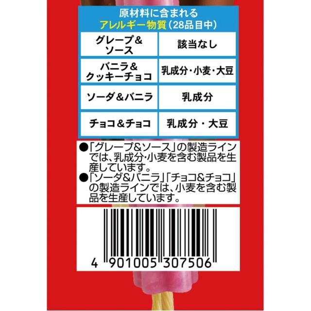 パティーナ バニラ&クッキーチョコ→準チョコレート(国内製造)、砂糖、植物油脂、乳製品、水あめ、クッキー/香料、乳化剤、安定剤(増粘多糖類)、カロチン色素、(一部に乳成分・小麦・大豆を含む)