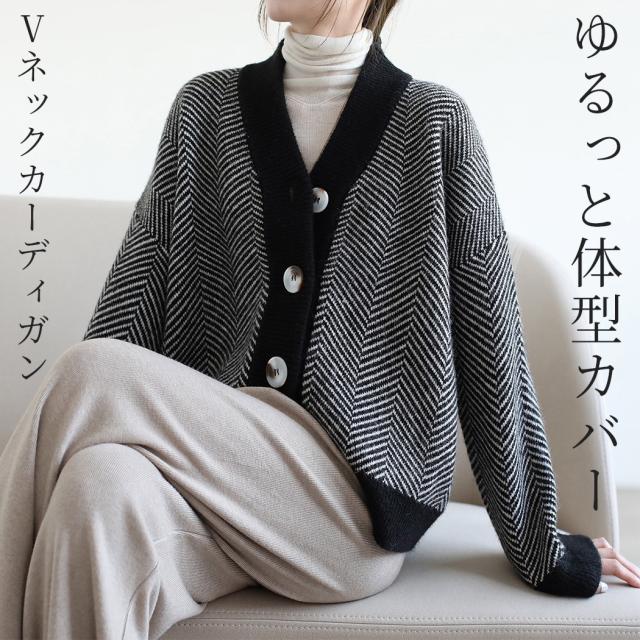 「柄は真面目に着心地は楽に」カーディガン レディース トップス 長袖 Vネック きれいめ ジャガード ニット 羽織 防寒 暖かい ボタン 前開き 袖リブ 伸縮性 ドロップショルダー オーバーサイズ 中厚手 ヘリンボーン 無地 配色 黒 白 秋 冬