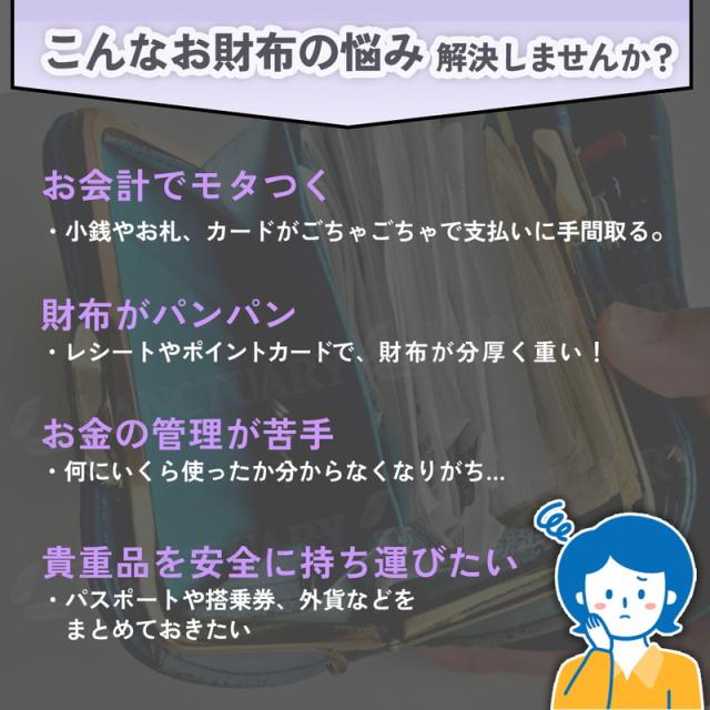 | 商品の説明 | こんなお財布の悩みを解決しませんか? お会計でモタつく ・小銭やお札、カードがごちゃごちゃで支払いに手間取る。 財布がパンパン ・レシートやポイントカードで、財布が分厚く重い! お金の管理が苦手 ・何にいくら使ったか分からなくなりがち 貴重品を安全に持ち運びたい ・パスポートや搭乗券、外貨などをまとめておきたいなど 【高級感あふれるレザー風素材】上質な素材と、持ち運びやすさを両立。どんな場面でも使える実用性が魅力です。 【たくさん入る大容量収納】通帳、ポイントカードやキャッシュカード、パスポートやお薬手帳などの収納に。 【多層仕切りデザイン】大きく開くじゃばらで一目で見えるから整頓上手に。 【持ち運びやすいサイズ感】便利なストラップ付きでさっと持ち出せるサイズ感です。スマホも入るちょうどいいサイズ感で急な外出でもすぐに持ち出せます。 【選べるカラー展開】高級感あふれるカラーバリエーションで大切な方へのギフトにもおすすめ。ファスナーやロゴ、縫製や細部にもこだわった美しいデザインです。 |