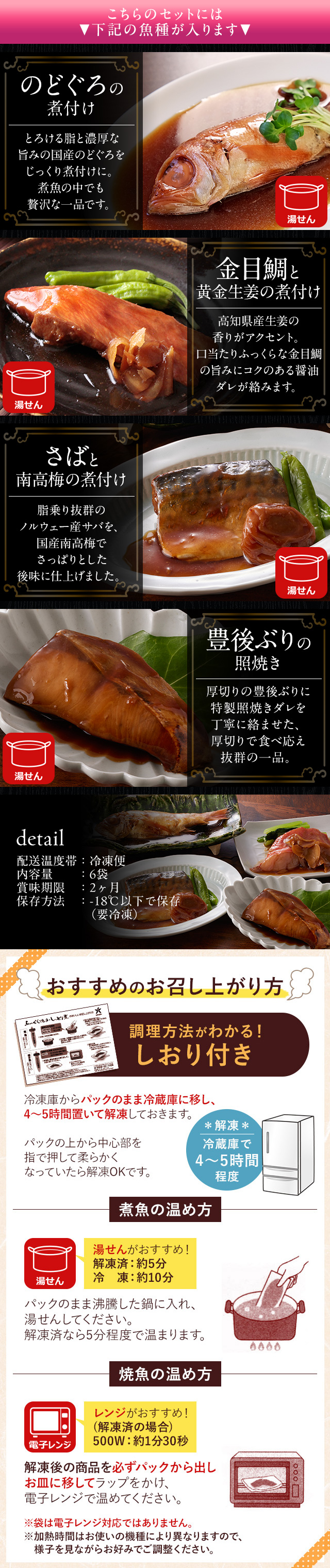 | 内容量 | 【のどぐろの煮付け】85g×1袋 【金目鯛と黄金生姜の煮付け】100g×2袋 【さばと南高梅の煮付け】110g×2袋 【豊後ぶりの照焼き】90g×1袋 |