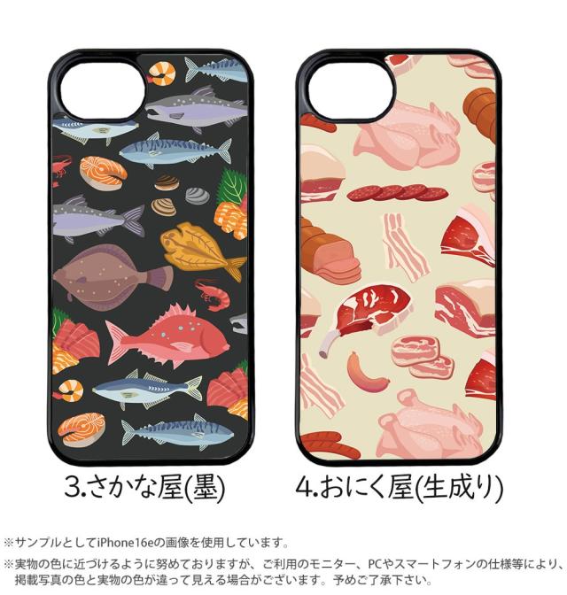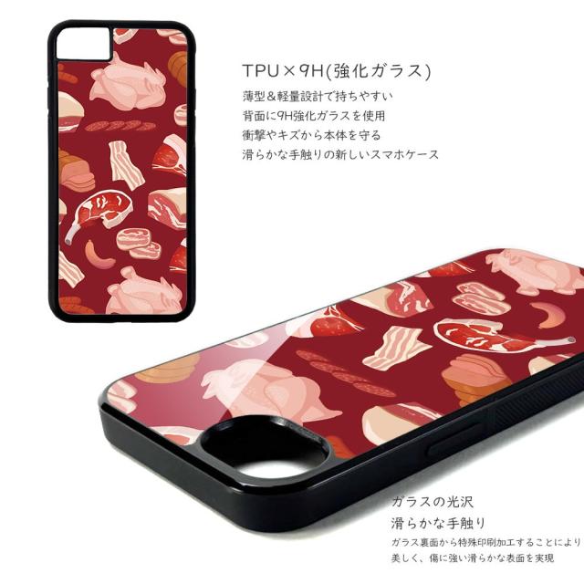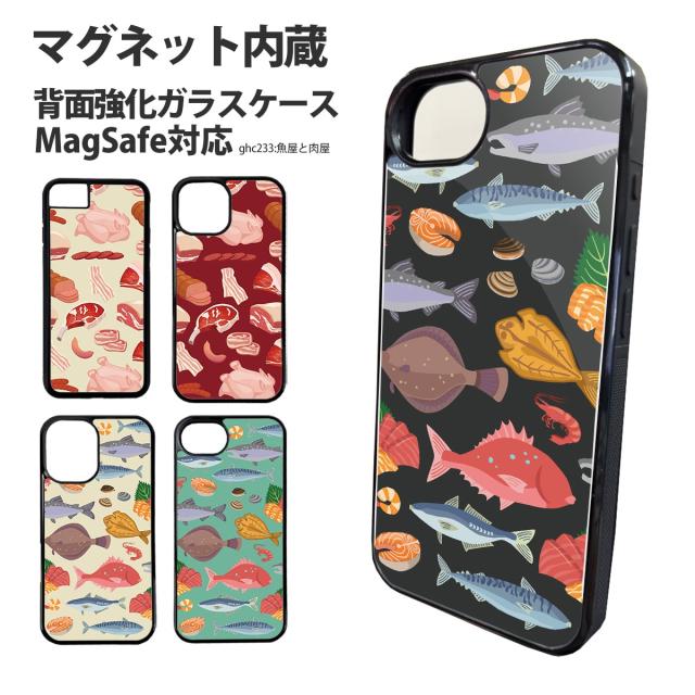 スマホケース 背面ガラス iPhone 17 iPhone 16e SE 第3世代 バンパーケース 強化ガラス MagSafe マグネット内臓 iPhone15 SE 第2世代 デザイン 魚屋と肉屋 手書き風 イラスト 魚 鮮魚 さかなや 魚屋 海鮮 海の生き物 魚好き 肉好き