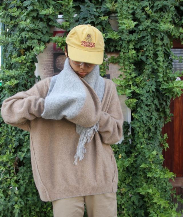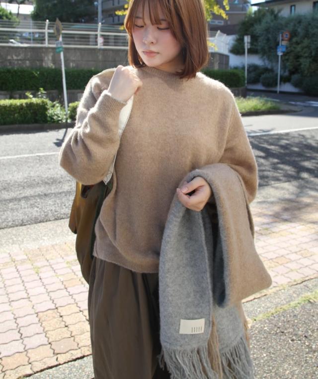 柔らかいベビーアルパカ配合のタムヤーン(起毛糸)を使用。柔らかな起毛が肌触りの良い滑らかなタッチを生み、ボリューム感のある編み地が特徴。温かみと軽量感を兼ね備えた上質な素材感。