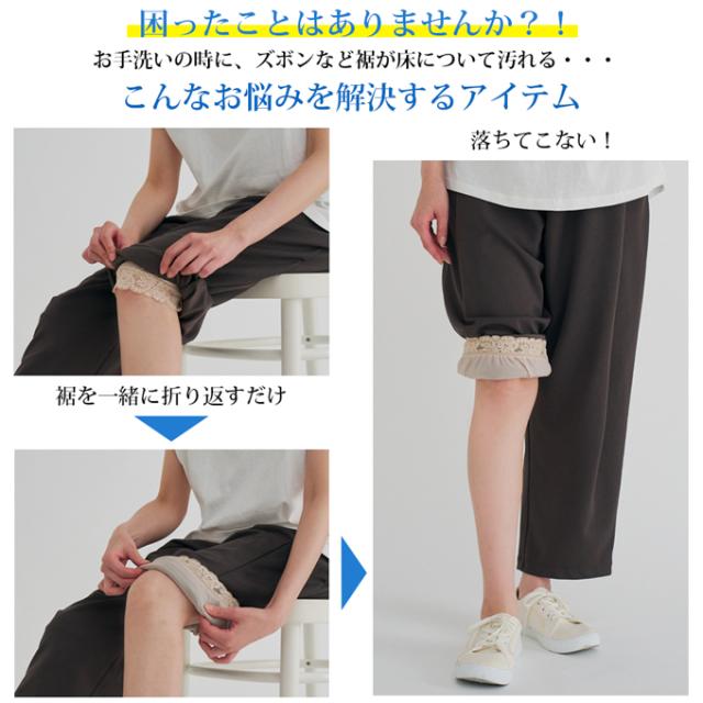 裾に伸縮性の良いレースを使用しているのでズボンと一緒にまくり上げてズレ落ちない。