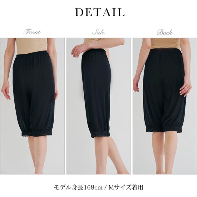 裾に伸縮性の良いレースを使用しているのでズボンと一緒にまくり上げてズレ落ちない。生地も柔らかくさらしとした風合いで軽やかな着心地です。ウエスト部分はゆったり設計!お腹への食い込みも苦しさも1日履いても気になりません。下着のラインや裏地のないアウターの下にもピッタリなアイテムです。パンツやスカート問わず、1枚あると便利なアイテムです。