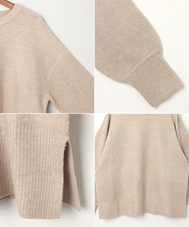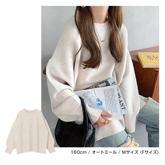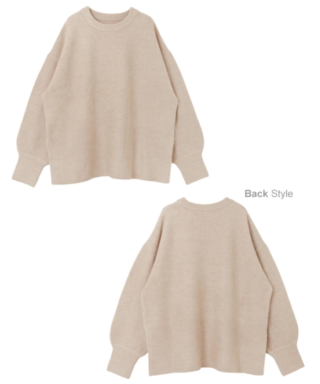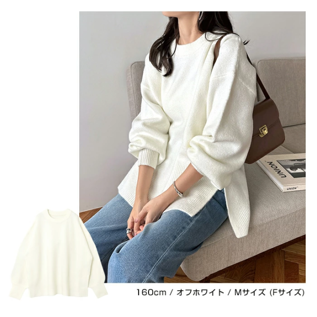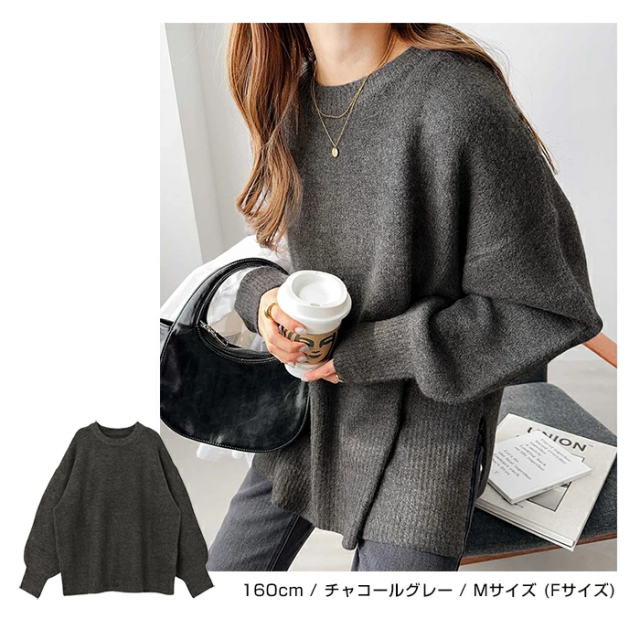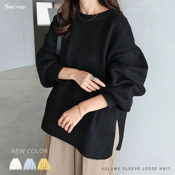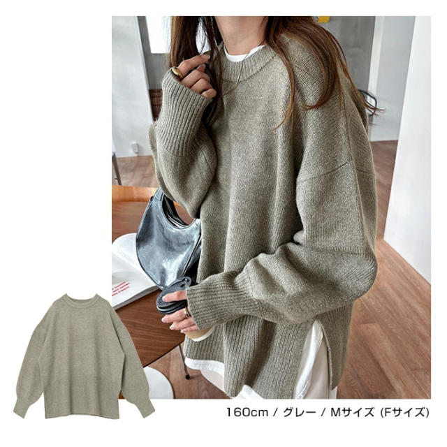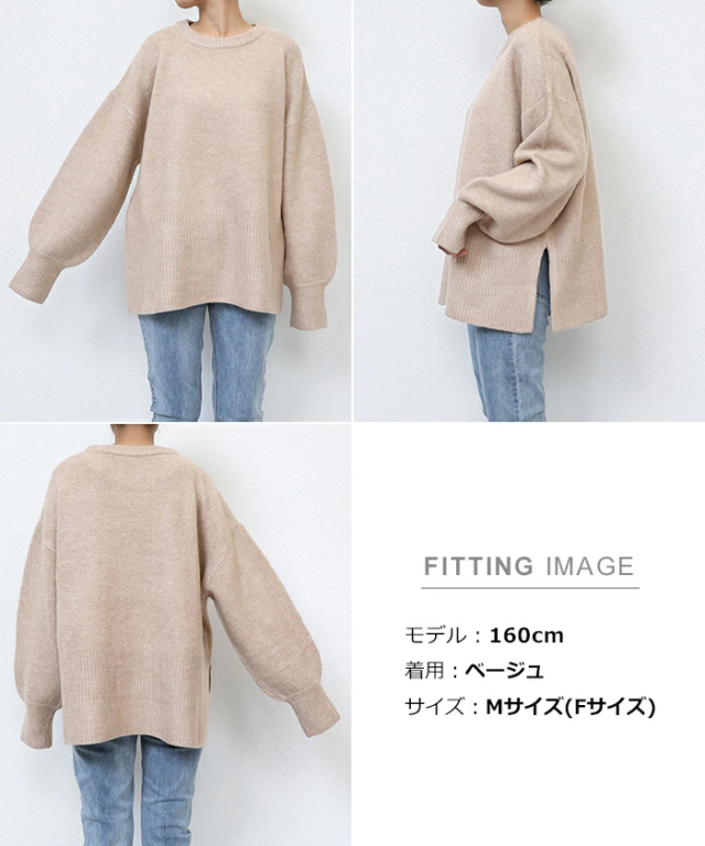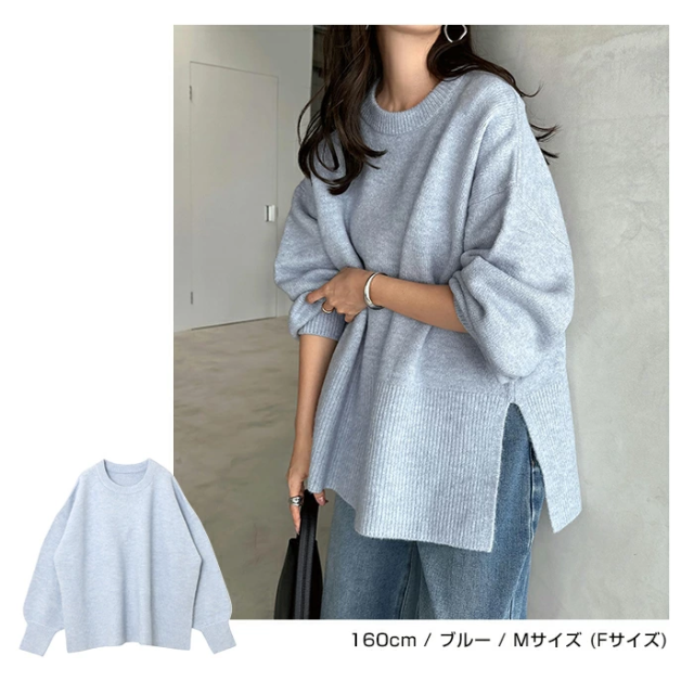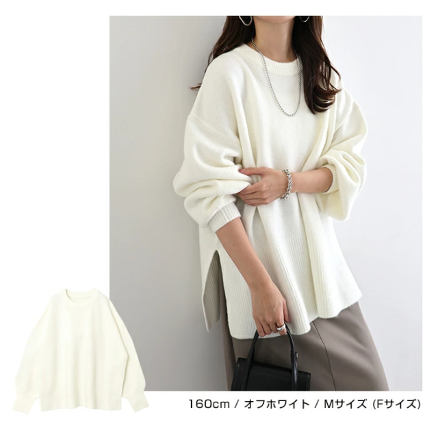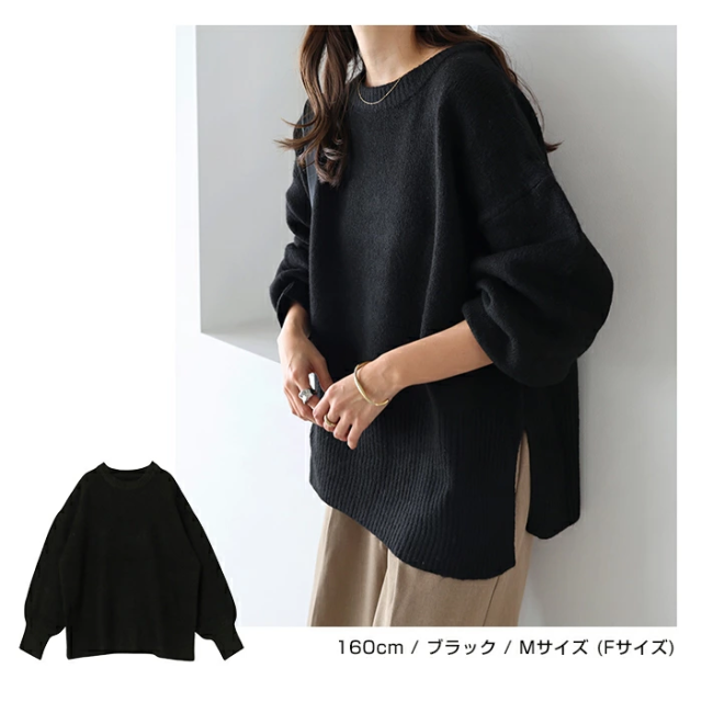 t04 天竺編み ボックスシルエット 長袖 ニット トップス レディース ニットトップス セーター プルオーバー オーバーサイズ 長袖ニット 長袖トップス シンプルニット 体型カバー ゆったり チュニック ボリューム袖 サイドスリット 楽ちん カジュアル 秋冬 春 秋 冬
