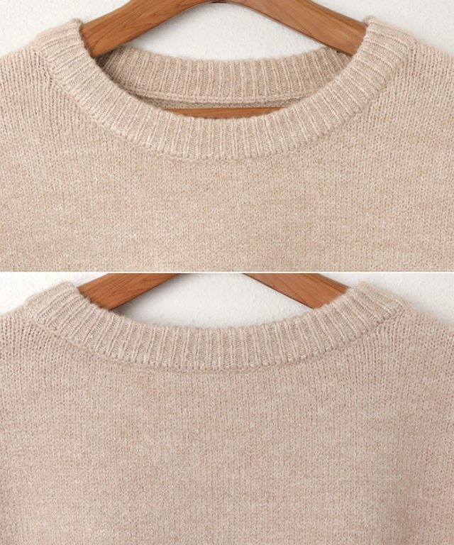 やや首の詰まったシンプルなクルーネックや