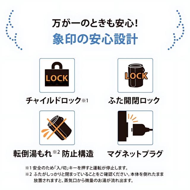 「チャイルドロック」「ふた開閉ロック」「転倒湯もれ防止構造」※2を搭載