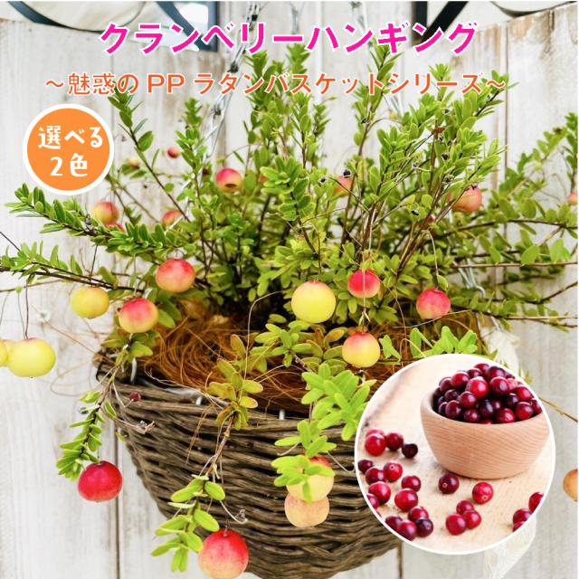 2色から選べる吊り下げタイプのハンギングバスケットにクランベリーを植え付けてお届けします。