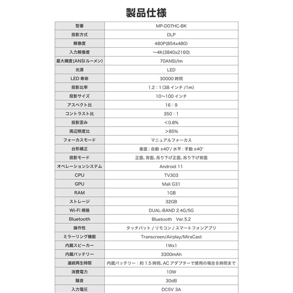 投影方式:DLP 解像度:480P(854×480) 入力解像度:~4K(3840×2160) 最大輝度(ANSIルーメン):70ANSI/lm 投影比率:1.2:1(38インチ/1m) 投影サイズ:10~100インチ アスペクト比:16:09 コントラスト比:350:01:00 フォーカスモード:マニュアルフォーカス 台形補正:垂直:自動 ±40°/水平:手動±40° 投影モード:正面、背面、吊り下げ正面、吊り下げ背面 オペレーションシステム:Android 11 CPU:TV303 GPU:Mali G31 RAM:1GB ストレージ:32GB 操作性:タッチパット/リモコン/スマートフォンアプリ ミラーリング機能:Transcreen/Airplay/MiraCast 内蔵スピーカー:1Wx1 内蔵バッテリー:3300mAh 連続再生時間:内蔵バッテリー:約1.5時間、ACアダプターで使用の場合8時間まで 入出力端子:HDMI端子(mini/C)x1/USB端子(TypeA)x1 / 3.5mm オーディオx1 / DC 電源入力端子x1 付属品:取扱説明書、リモコン、リモコンテスト用電池(単4形x 2本)、HDMIケーブル、ACアダプター、3脚(雲台)、スマートフォン有線接続用ケーブル サイズ:60x60x58mm 質量:210g ※記載は商品仕様の一部です。仕様説明不足等の理由での返品はできません。特に適合等は必ずご確認ください。