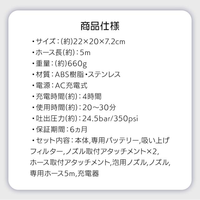 ホース取付アタッチメント、泡用ノズル、専用ホース5m、充電器