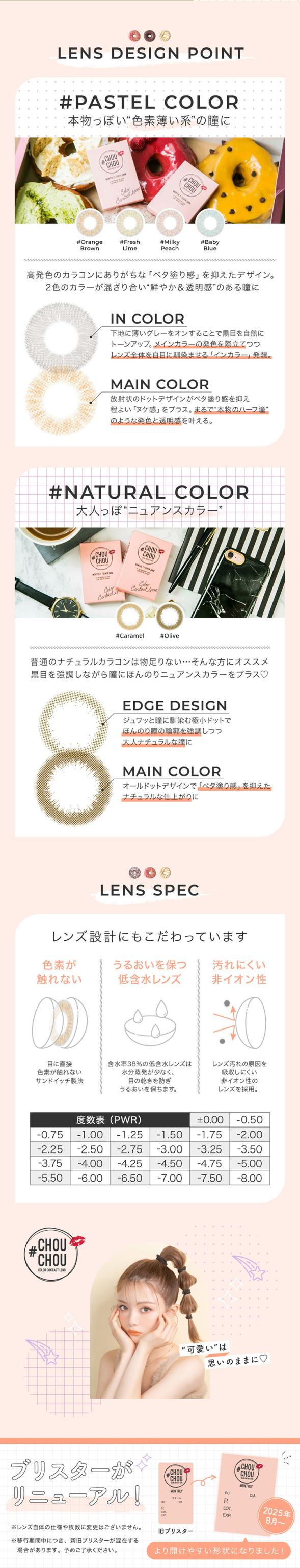 ・度数:±0.00(度なし)、0.50 〜 -5.00(0.25step)、-5.50 〜 -8.00(0.50step)