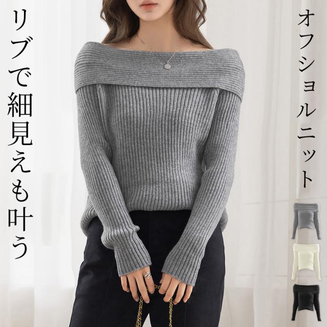 デコルテ周りをキレイに見せるオフショルデザイン&リブニットの縦ラインで華奢見えも叶うのが嬉しいポイント。