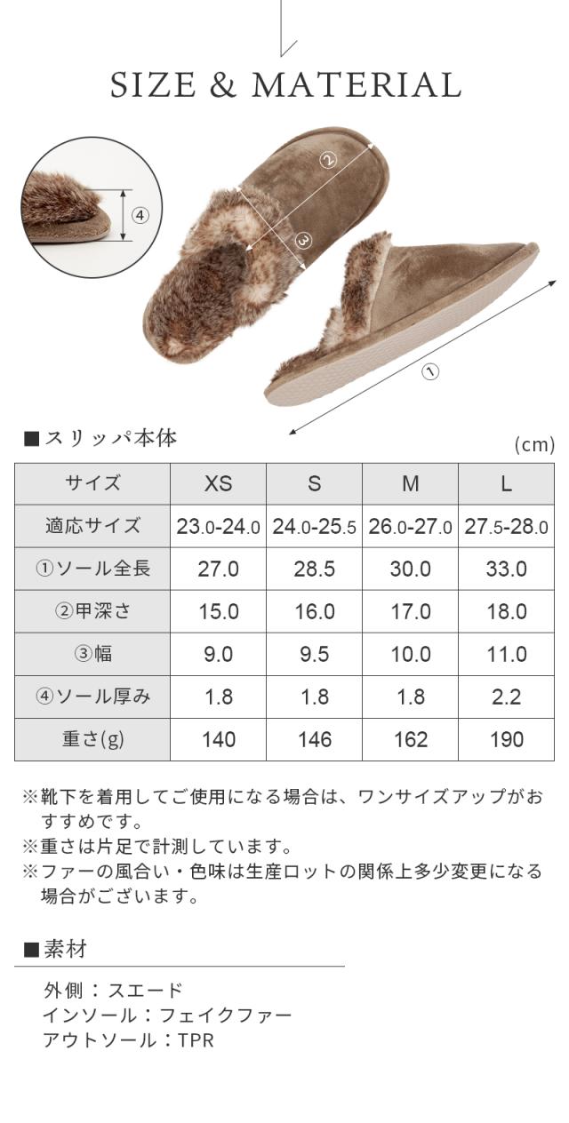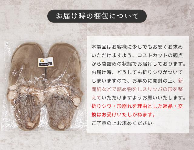 ※靴下を着用してご使用になる場合は、ワンサイズアップがおすすめです。 ※重さは片足で計測しています。 ※ファーの風合い・色味は生産ロットの関係上多少変更になる場合がございます。 ※本製品はお客様に少しでもお安くお求めいただけますよう、コストカットの観点から袋詰めの状態でお届けしております。 お届け時、どうしても折りシワがついてしまいますので、お早めに開封の上、新聞紙などで詰め物をしスリッパの形を整えていただけますようお願いいたします。 折りシワ・形崩れを理由とした返品・交換はお受けいたしかねます。ご了承の上お求めください。 |