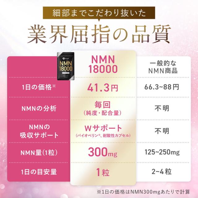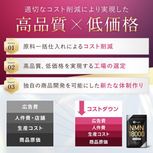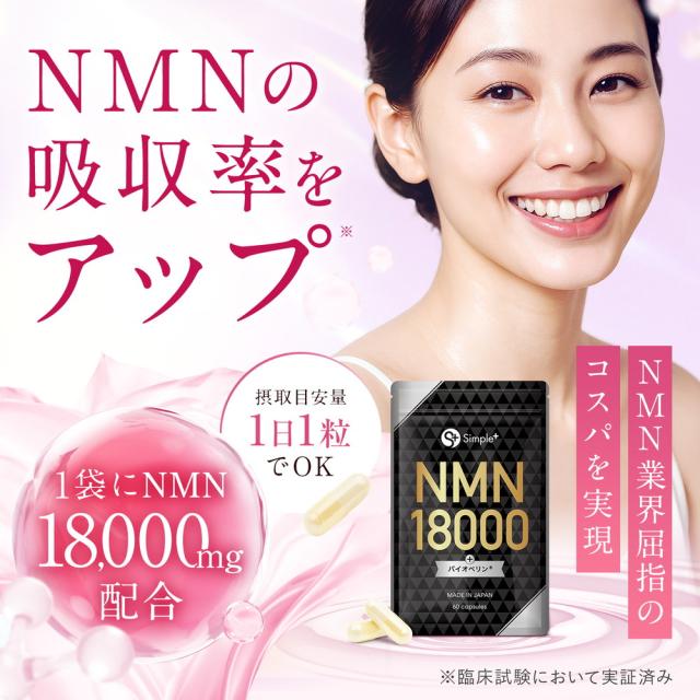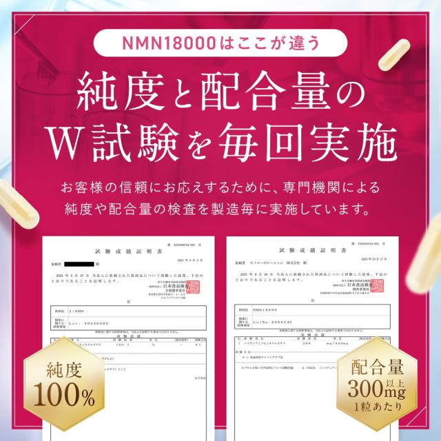 【高純度NMN100%】1袋に18,000mg(60粒)の高純度NMNを配合。1日1粒あたり300mgのNMNを手軽に摂取できます。さらにNMNは日本国内や世界各国で研究されているβ型のNMNを使用しています。