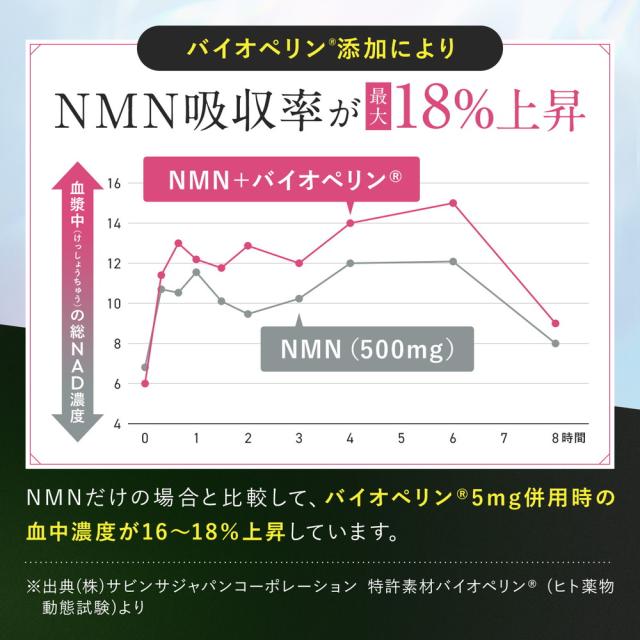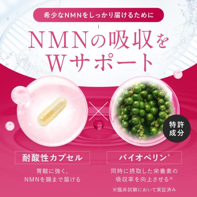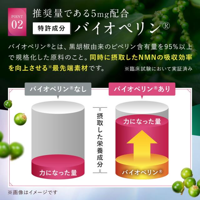 【NMNの吸収効率を向上】特許成分バイオペリンを推奨量5mg配合。黒胡椒由来のピペリンがNMNの吸収をサポートします。バイオペリン併用時におけるNMN吸収効率が向上されたことが、臨床試験において確認されています。