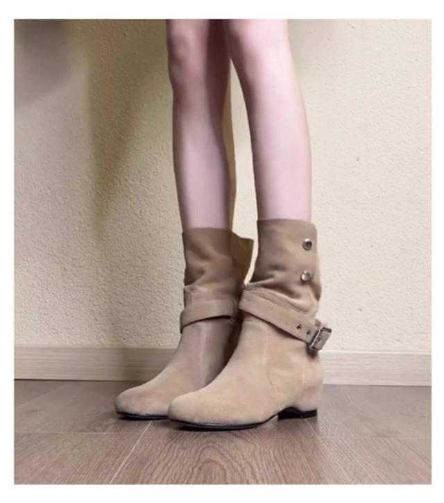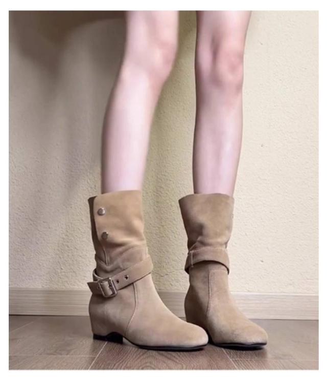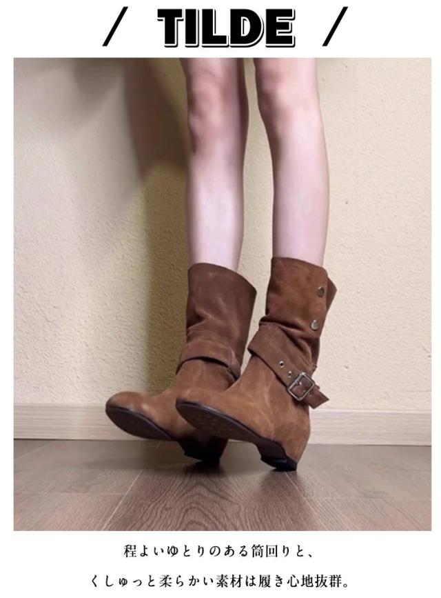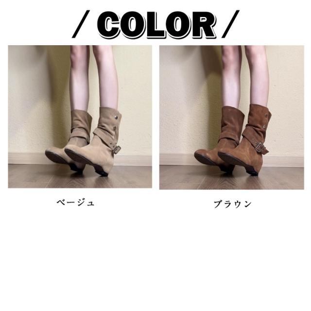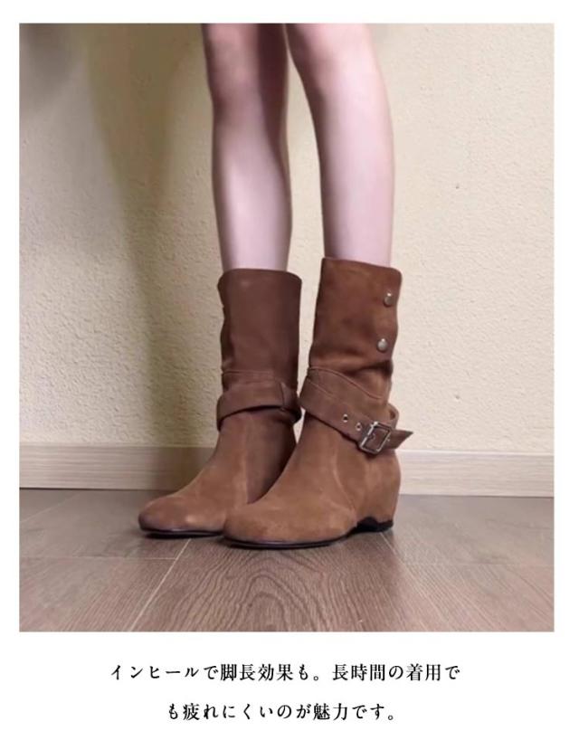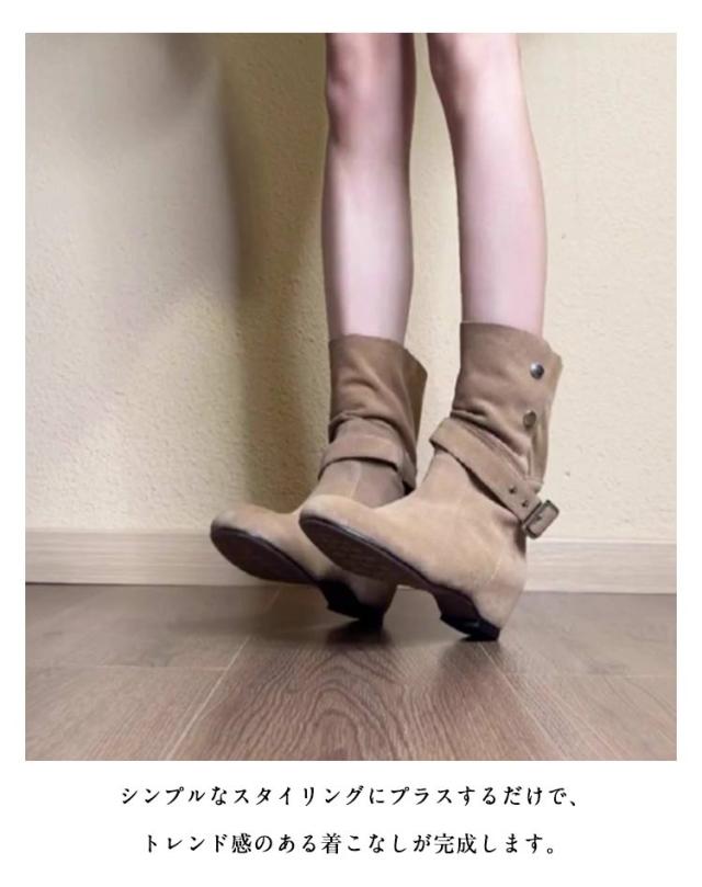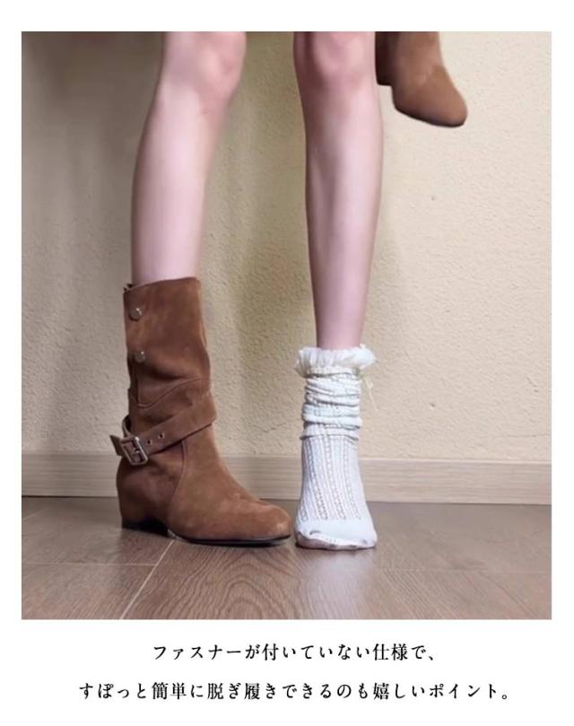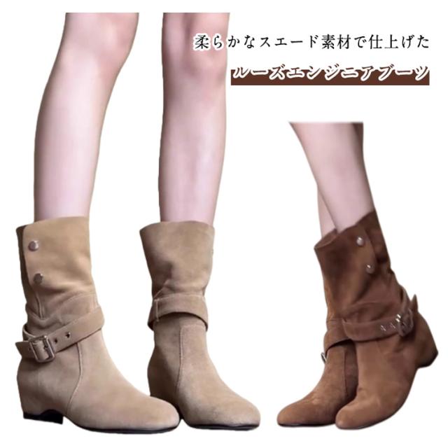 ラウンドトゥ バックル ローヒール ミドルブーツ ショートブーツ レディース エンジニアブーツ くしゅくしゅブーツ ベルト エンジニア インソール スエード 本革 ベルトブーツ 秋冬 防寒 防滑