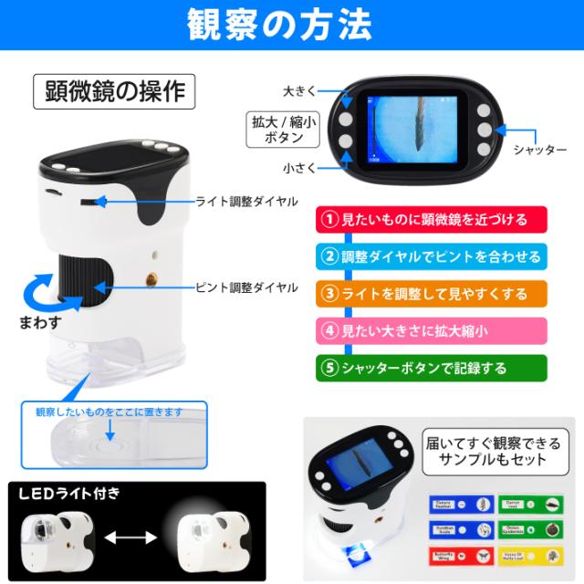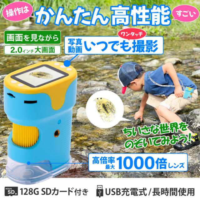 子供用 顕微鏡 カメラ 100-1000倍 ハンディー 小学生 充電式 コードレス 電子顕微鏡 マイクロスコープ USB 倍率調整 自由研究 植物の観察 教育 生物観察 昆虫 虫 子供 学習 植物 観察 デジタルズーム 録画 128G SDカード付