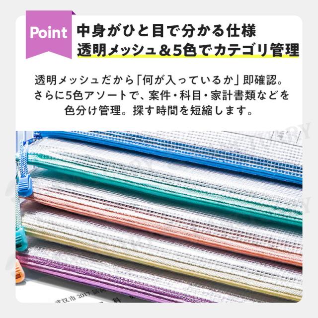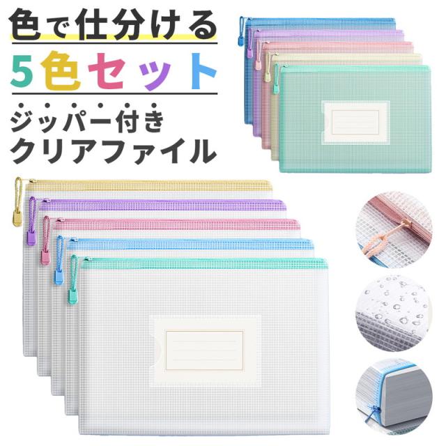 クリアファイル A4 ジッパー付き 5色セット書類収納 ファスナー付き メッシュ クリアポーチ書類ケース 書類整理 大容量仕分け フォルダ 事務用品 学校 プリント 整理 収納在宅ワーク オフィス 旅行 書類 領収書 母子手帳ケース 医療証 水に強い