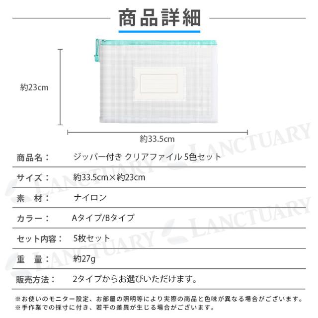 | 主な仕様 | 商品名 ジッパー付き クリアファイル 5色セット サイズ 33.5cm×23cm 素材 ナイロン カラー/種類 Aタイプ Bタイプ セット内容 5枚セット 重量 27g 販売方法 2タイプからお選びいただけます |