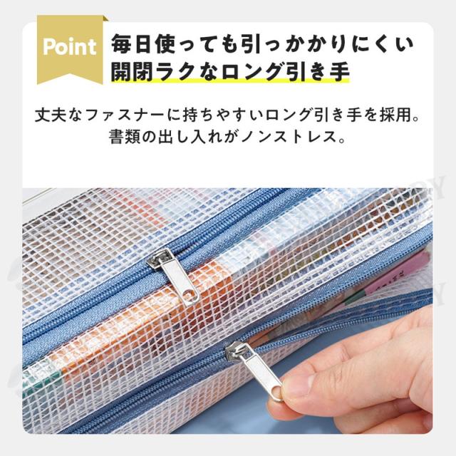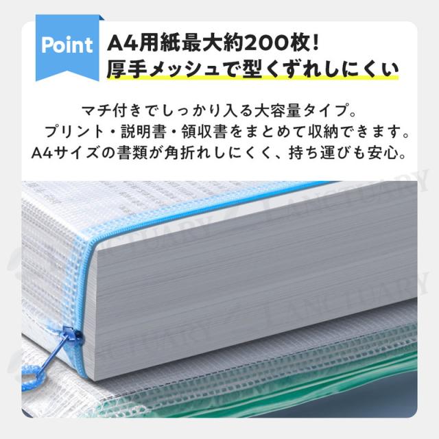 学校やオフィス、自宅での書類収納にぴったり。A4用紙を最大約200枚収納できる大容量タイプで、プリント・説明書・領収書・契約書などをまとめて保管できます。厚手メッシュ仕様で型くずれしにくく、持ち運びの際も安心です。