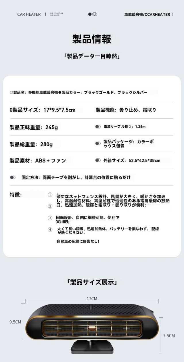 車載ヒーター自動車ヒーター車用ヒーター車用【製品名】: 車載ヒーター【製品サイズ】: 約17*9.5*7.5cm【電源コード長】: 約1.25m【製品色】:金色、銀色【製品性能】:除霜除霧【製品パワー】:12v 120w【製品正味重量】:245g【固定方式】:底部両面テープ貼り付け【生産国】:CN