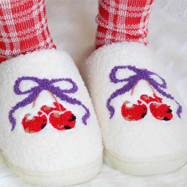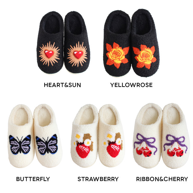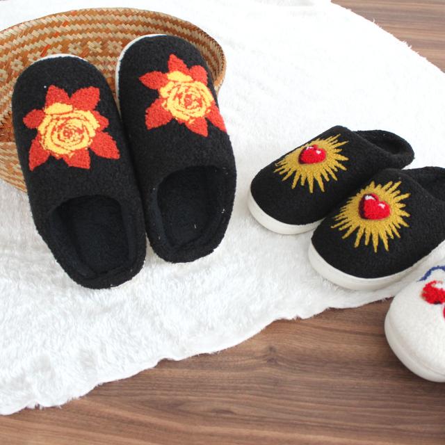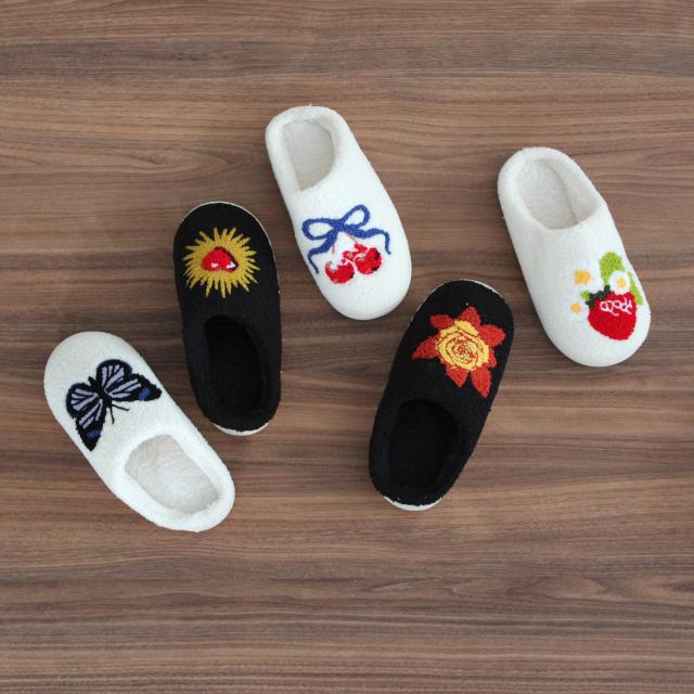 個性豊かなモチーフ刺繍が目を引くふんわり柔らかなスリッパ。