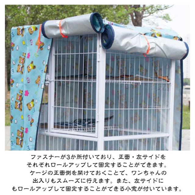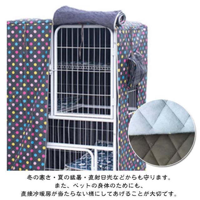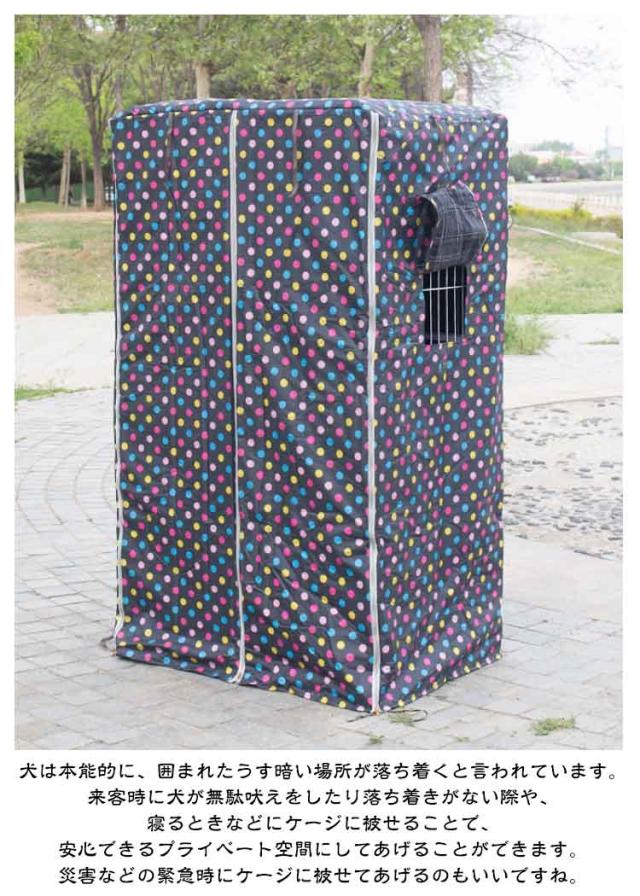 | 目隠しや保温、遮光効果のあるペット用ケージカバーです。【71*55*127cm?78*55*137cm?96*65*147cm?96*64*170cm】 犬は本能的に、囲まれたうす暗い場所が落ち着くと言われています。来客時に犬が無駄吠えをしたり落ち着きがない際や、寝るときなどにケージに被せることで、安心できるプライベート空間にしてあげることができます。災害などの緊急時にケージに被せてあげるのもいいですね。 冬の寒さ・夏の猛暑・直射日光などからも守ります。また、ペットの身体のためにも、直接冷暖房が当たらない様にしてあげることが大切です。 抜け毛が気になる季節には、ケージカバーをかぶせることで広範囲に散らばることを防ぎます。 ファスナーが3か所付いており、正面・左サイドをそれぞれロールアップして固定することができます。ケージの正面側を開けておくことで、ワンちゃんの出入りもスムーズに行えます。また、左サイドにもロールアップして固定することができる小窓が付いています。 水を通しにくい素材を使用していますので、水にぬれてもサッとひと拭きで汚れを落とすことができます。突然の雨からもペットを守ります。また、裏地は遮光性の高い生地を採用。夏の暑い日もケージ内の温度上昇を和らげます。 | |