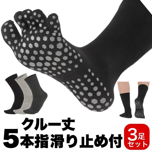 5本指ソックス メンズ クルー丈 滑り止め靴下 滑り止め付き 3足セット 靴下 黒 グレー スポーツ スポーツソックス ランニングソックス 綿素材 綿混 オールシーズン ゴルフ テニス ジョギング トレーニング クルーソックス ミドル丈