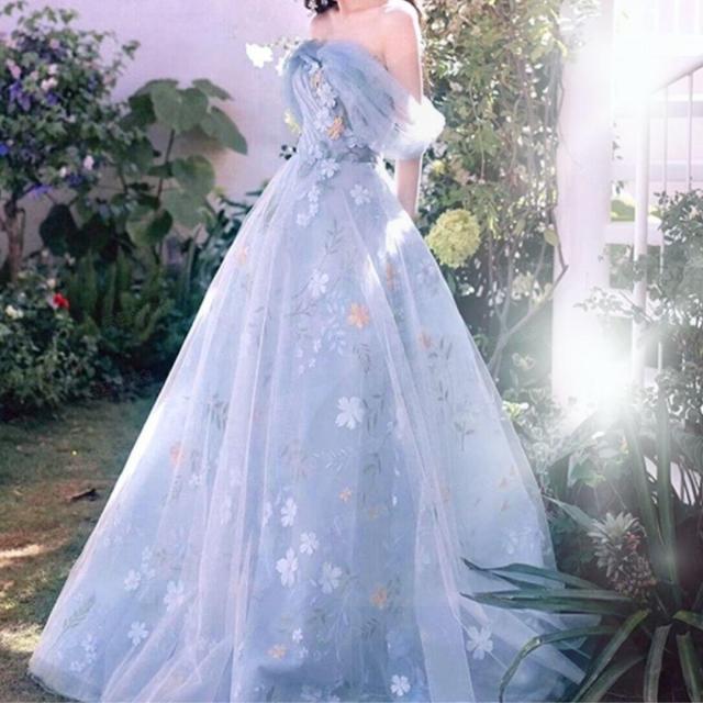結婚式・パーティードレス お花が可愛い水色オフショルダー プリンセスドレス ウエディングドレス 披露宴