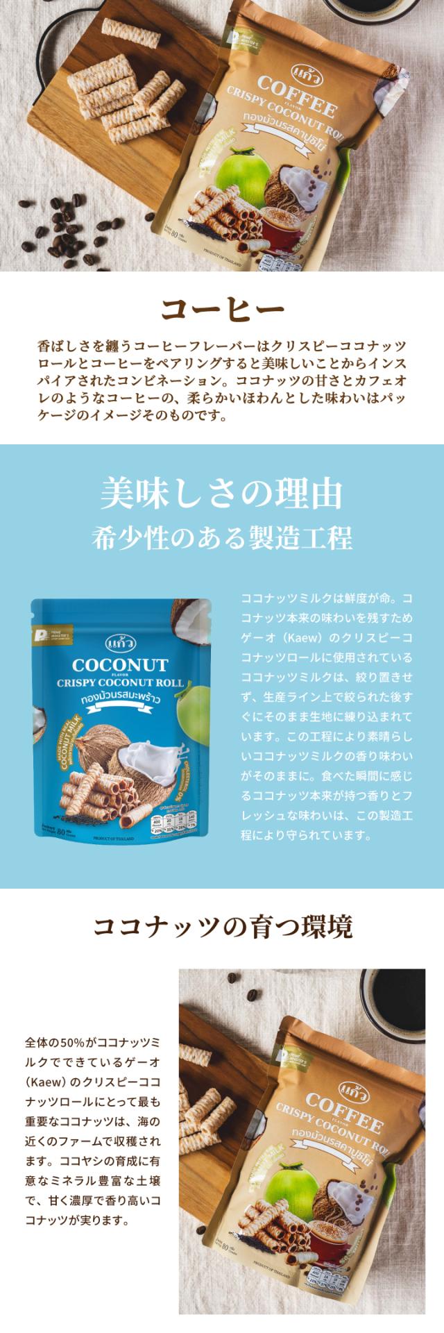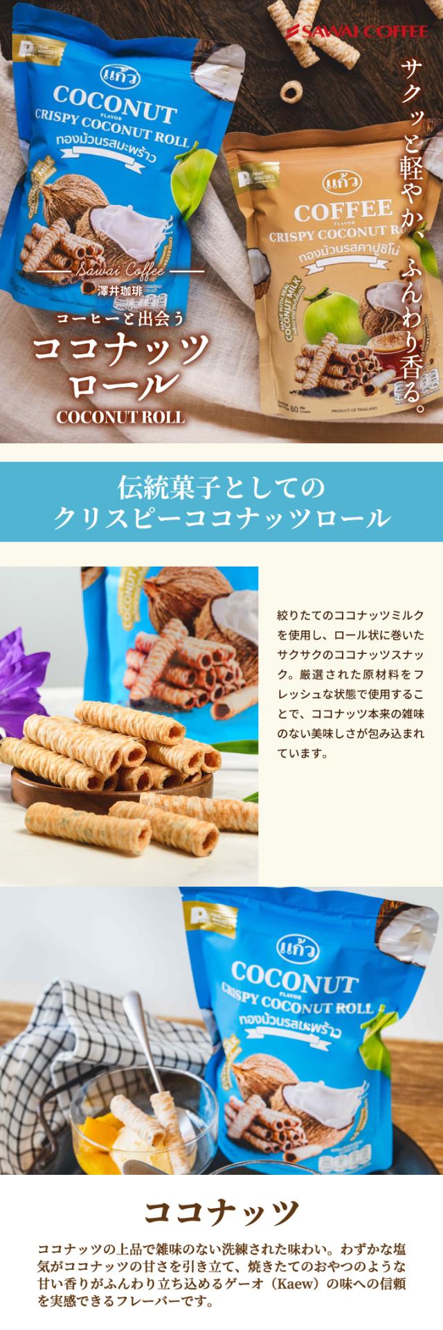 | 香ばしいココナッツミルクをたっぷり使い、サクッと軽やかな食感に焼き上げたタイの伝統菓子「クリスピーココナッツロール」。素材の自然な甘みと優しい香りがふんわり広がり、コーヒーにもぴったりのトロピカルスイーツです。 1.絞りたてココナッツミルクの贅沢な風味 このココナッツロールは、搾りたてのフレッシュなココナッツミルクを贅沢に使用。生産ラインで絞ったミルクをそのまま生地に練り込むことで、自然の香りと甘みを閉じ込めています。ココナッツ独特の雑味がなく、まろやかでクリーミーな味わいが特徴。ひと口食べると、南国の風を感じるような優しい香りが広がります。 2.サクッと軽やか、ふんわり香る新食感スナック ロール状に焼き上げた生地は、外はサクッ、中はふんわり。軽い食感と自然な甘みのバランスが絶妙で、ついもう一本と手が伸びる美味しさです。コーヒーや紅茶との相性も抜群で、リラックスタイムや来客時のお茶うけにもぴったり。お子様から大人まで楽しめるシンプルな美味しさが魅力です。 3.世界が認めた品質と安心の素材 国際味覚審査機構「Superior Taste Award 2023」で2ツ星を獲得し、タイ政府の「Prime Minister’s Export Award 2020」でも表彰された品質。砂糖にはココナッツシュガーを使用し、化学的な添加物は使わずに仕上げています。素材の味をいかした自然な甘さと香ばしさは、安心して毎日のおやつに楽しめる一品です。 | |