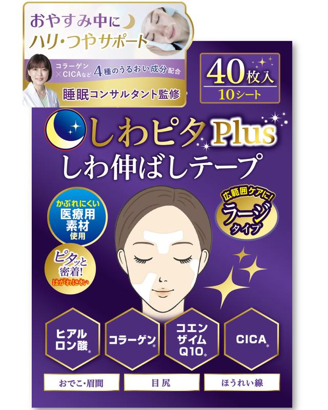 「しわピタPlus」は、気になるシワや部位に合わせてポイントタイプ・目元/ほうれい線タイプ・ラージタイプから選べる、使いやすいナイトケアテープです。