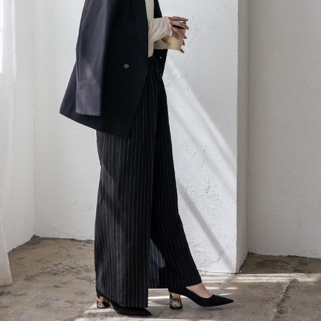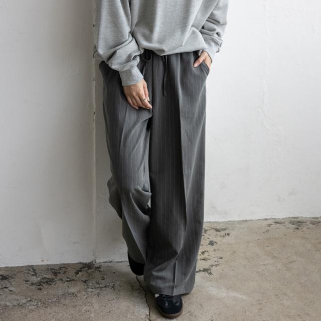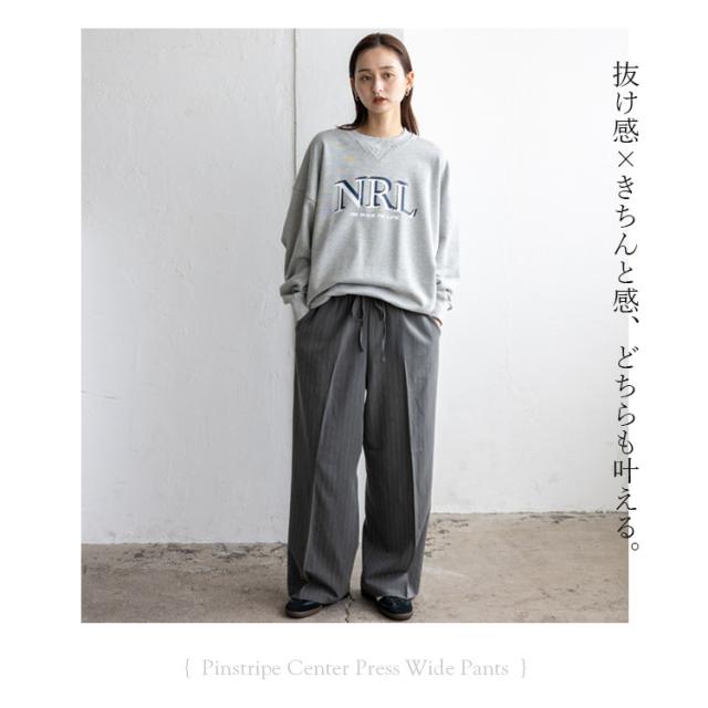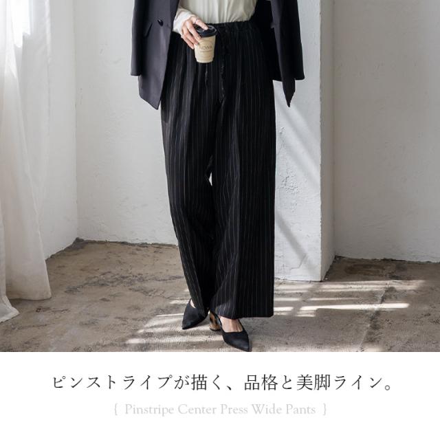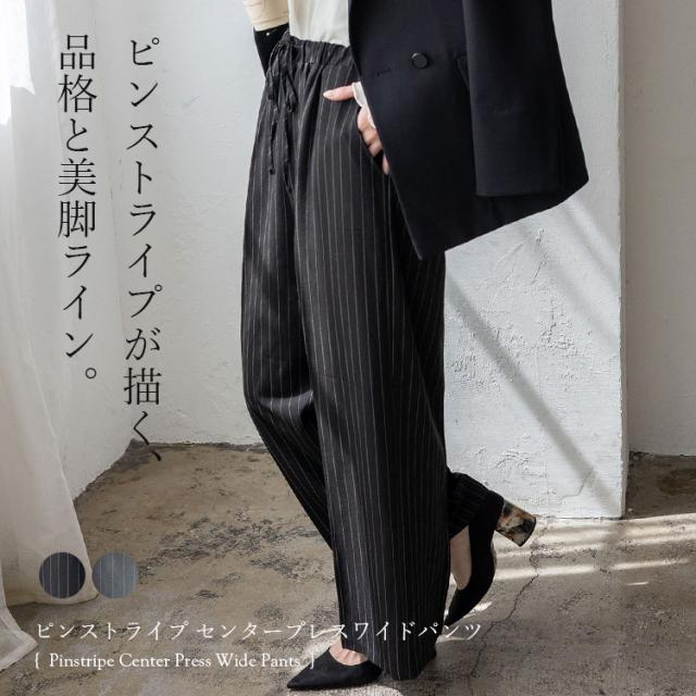 ピンストライプ柄のセンタープレスワイドパンツ。