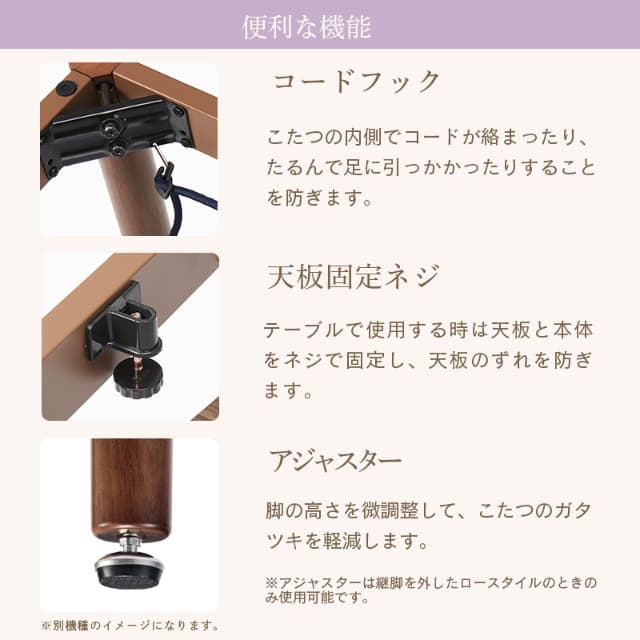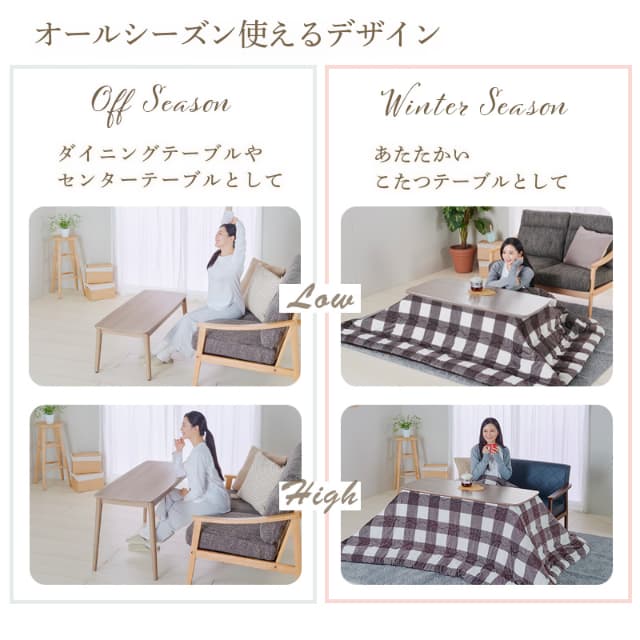 - 継脚付きでこたつの高さを42cm/62cmの2段階に調節可。