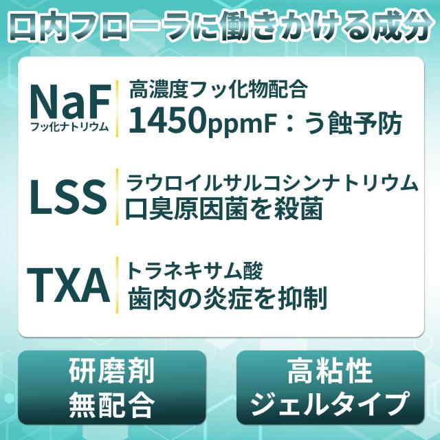 薬用成分:酢酸トコフェロール(ビタミンE)、グリチルリチン酸ジカリウム(GK2)、イソプロピルメチルフェノール(IPMP)、トラネキサム酸、ラウロイルサルコシンNa、フッ化ナトリウム(1450ppmF)