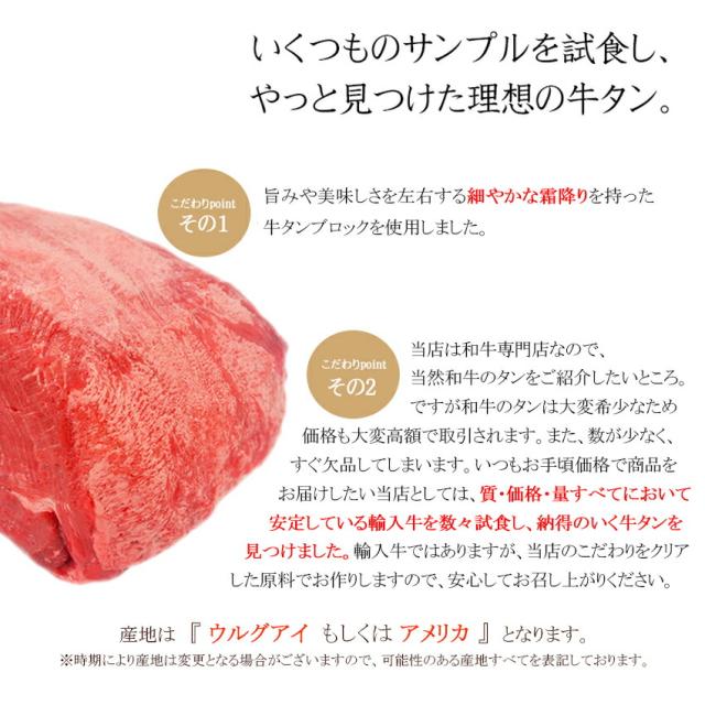 | 原材料 | 牛タン(ウルグアイもしくはアメリカ産) |