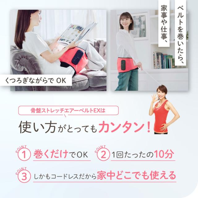 | 検索キーワード | Micacoインスパイリング、骨盤ベルト、骨盤ストレッチ、骨盤ケア、骨盤補正、骨盤矯正ベルト、温感ベルト、EMSベルト、骨盤サポート、姿勢補正、骨盤引き締め、骨盤ダイエット、骨盤エクササイズ、骨盤まわりケア、骨盤ストレッチベルト、骨盤サポートベルト、骨盤まわり引き締め、腰サポート、コルセット、腰ベルト、美尻ベルト、くびれケア、骨盤エアーベルト、Micaco監修、インスパイリングEX、Micacoエアーベルト、ダイエットサポート、スタイルアップ、ヒップケア、骨盤リセット | 商品説明 | エアーの力と温感機能のWアプローチで“ながら骨盤ケア”を叶える「Micacoインスパイリング 骨盤ストレッチエアーベルトEX」。骨盤ストレッチエアーベルトがさらに進化し、しっかり温める温感機能を新搭載。約45℃/52℃の2段階設定で温感オフも可能。心地よいぬくもりが筋肉をやさしくほぐし、エアーの力で骨盤まわりをしっかり整えます。「仙骨サポートポール」もサイズアップし、骨盤まわりをしっかり「整える」動きを強化。ベルトの面積も従来比約120%に拡大し、よりしっかりフィット。ホールド感と安定感が大幅に向上しました。さらに、エアー強度は5段階調整が可能になり、3種のオートモード(エクササイズ・ストレッチ・美脚)から目的に合わせてケアが選べます。コントローラーも大きくなり、視認性と操作性がアップ。コードレス設計で、家事をしながら、くつろぎながら、どこでも手軽に使えます。1回たった10分。カラーはライトブラックとコーラルピンクの2色から選べます。 |