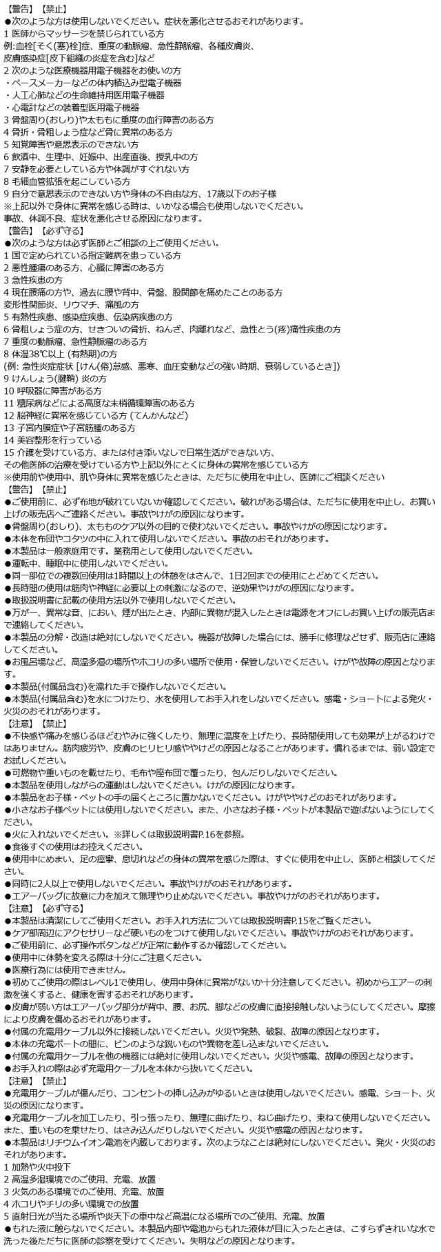 | 商品仕様 | [電源]充電式(リチウムイオン電池内蔵 2,400mAh/3.7V) [定格消費電力]最大8W [充電時間]約220分 (※充電時間は付属の充電用ケーブルで充電した際の目安です) [電池持続時間] エアー+温感:約90分(1モード10分を9回使用)※ エアーのみ:約140分(1モード10分を14回使用)※ ※メーカー推奨の使用方法に準じます。 実際の時間は、使用環境や使用状況により異なります。 |