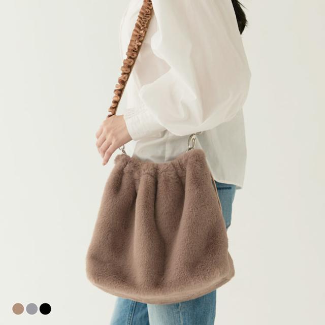 フリルのショルダーが愛らしい巾着ファーバッグ。