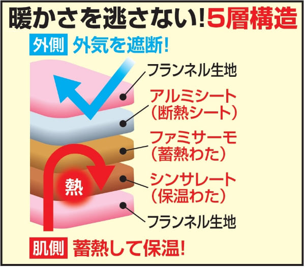 【カラー】ピンク、グリーン、ブラウン【サイズ】掛布団:190×210cm、敷パッド:140×205cm【重さ】掛布団:2.4kg、敷パッド:1.33kg【素材】[掛布団]第1層・第5層:フランネル生地、第2層:アルミ不織布(保温性アルミシート)、第3層:ポリエステル100%わた(蓄熱保温わたファミサーモ30%)、第4層:シンサレートM60(保温)、[敷パッド]第1層:フランネル生地、第2層:アルミ不織布(保温性アルミシート)、第3層:ポリエステル100%わた(蓄熱保温わたファミサーモ30%)、第4層:ポリエステル100%わた(吸湿発熱わた30%)、第5層:裏地(ポリエステル100%)【備考】丸洗いOK(ネット使用)【製造国】中国製