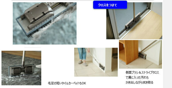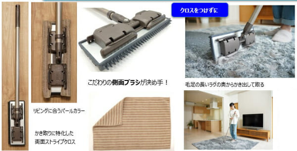フローリングモップの一種で、「楽な姿勢でぞうきんがけ」をコンセプトに開発された製品です。ヘッドの裏面には130個のゴムブレードが配置されており、床に密着してこびりついた汚れやフローリングの溝の汚れも効率よく拭き取ります。側面ブラシが付いており、カーペットの奥に入り込んだ髪の毛やペットの毛もしっかりとかき出せるため、フローリングだけでなくカーペットの掃除にも使えます。掃除機では取りきれないゴミも取れると好評です。ハンドルは伸縮式で長さ調節が自由にでき、最長135cmまで伸ばせるため、壁や窓、天井などの高い場所も楽に掃除できます。マイクロファイバークロスが付属しており、水拭き、乾拭き、ワックスがけなど様々な用途に使用できます。市販のフロアシートも取り付け可能です。ヘッドの厚みが薄く、家具の隙間や窓サッシ、冷蔵庫の隙間のような狭い場所の掃除にも便利です。