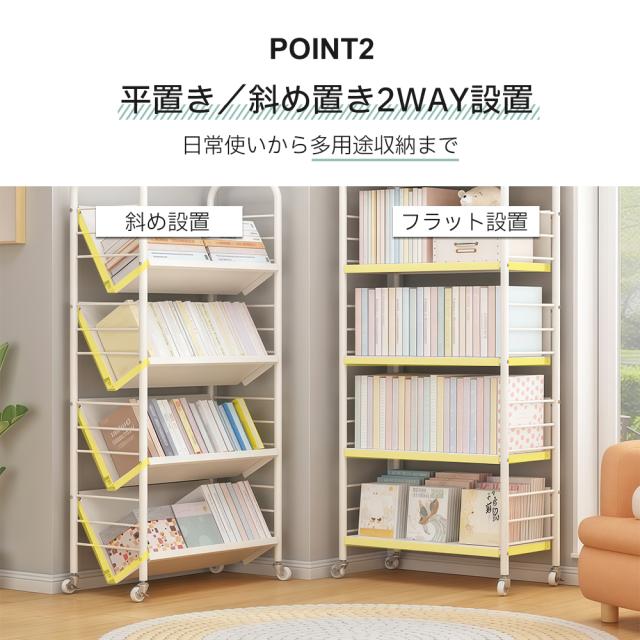 棚板をフラット設置すれば雑貨や箱ものの収納に、斜め設置すれば書籍や雑誌をすっきりと見やすく収納できます。全段を同じスタイルにしても、フラットと斜めをミックスさせてもOK。用途や好みに合わせてカスタマイズ可能です。