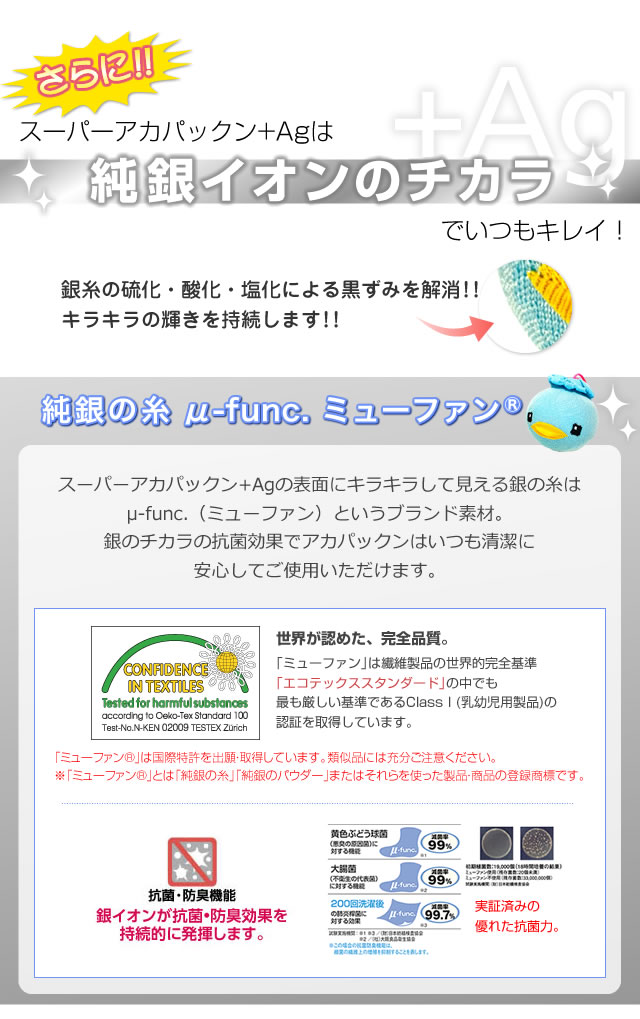 スーパーアカパックン+Agは、表面を純銀糸ミューファンを使用することで、抗菌・消臭効果があります。通常のご使用では特別なお手入れは必要ありませんが、毎日ご使用にならない場合は、乾燥した状態で保管して下さい。