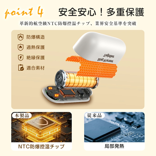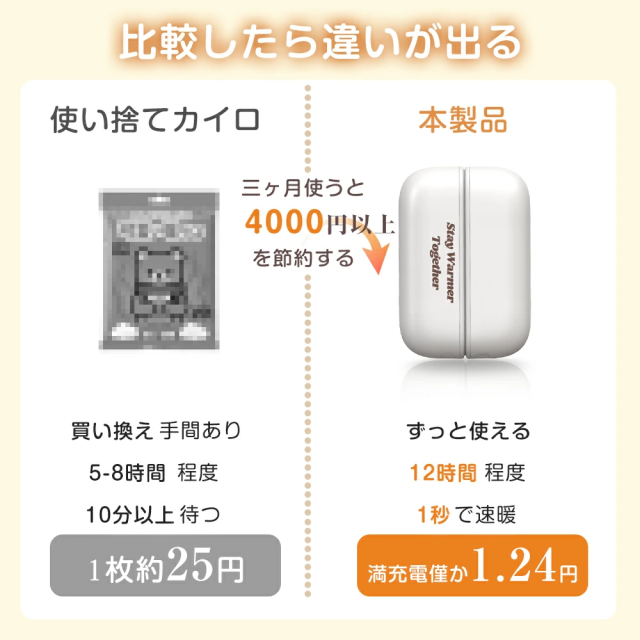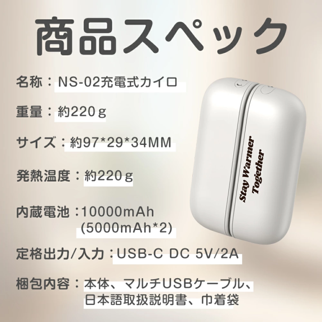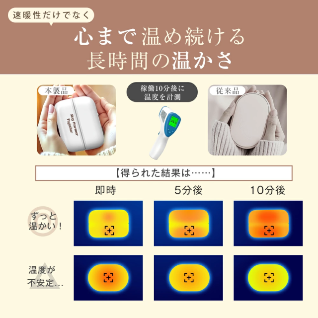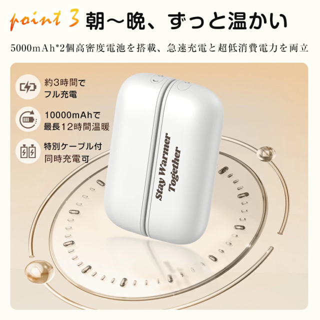 10000mAhの大容量バッテリーを搭載し、最大約12時間の連続発熱を実現。