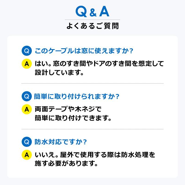 ●屋外から屋内へLANケーブルを引き込める、すきま用LANケーブルです。●窓の隙間やドアのすき間を利用するので、壁に穴を開けずにLANケーブルを引き込めます。