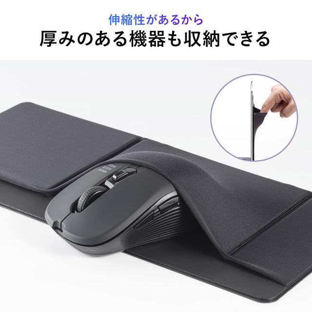 ●伸縮性のある素材で伸び縮みし、厚さのある機器も収納できます。