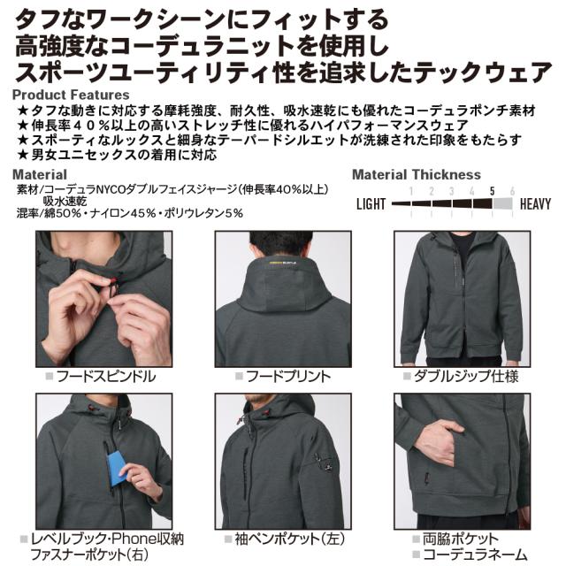 タフなワークシーンにフィットする高強度なコーデュラニットを使用しスポーツユーティリティ性を追求したテックウェア